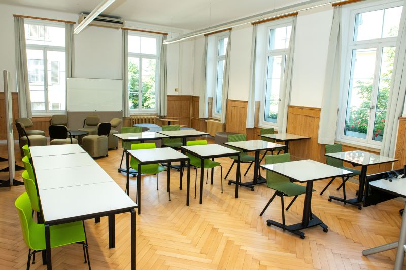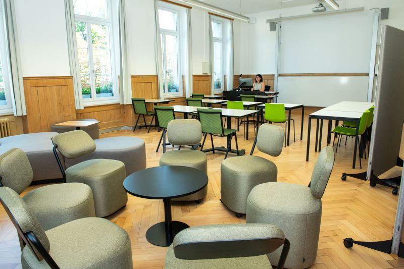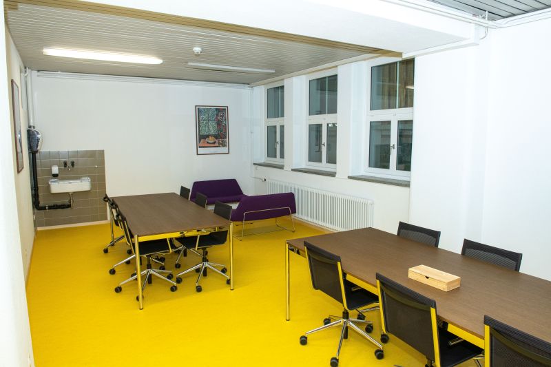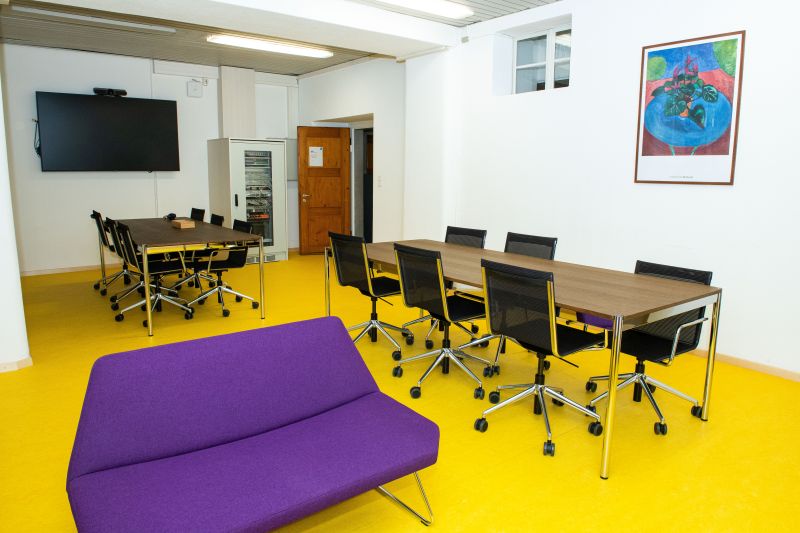 Der vielseitig nutzbare Raum bietet mit seiner durchdachten Ausstattung optimale Voraussetzungen für unterschiedliche Arbeitsformen: Klassische Tisch-Stuhl-Kombinationen ermöglichen konzentrierte Gruppenarbeiten und Sitzungen, während zusätzliche Polstermöbel ein entspannteres Ambiente für kreative Prozesse und informelle Besprechungen schaffen. Ein grosser Bildschirm erweitert die Funktionalität des Raumes erheblich und unterstützt sowohl die Vorbereitung von Präsentationen als auch moderne Arbeitsformen wie Videokonferenzen.